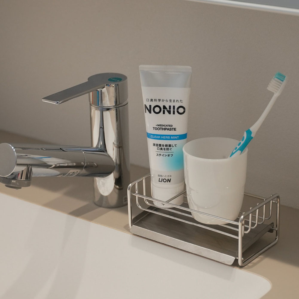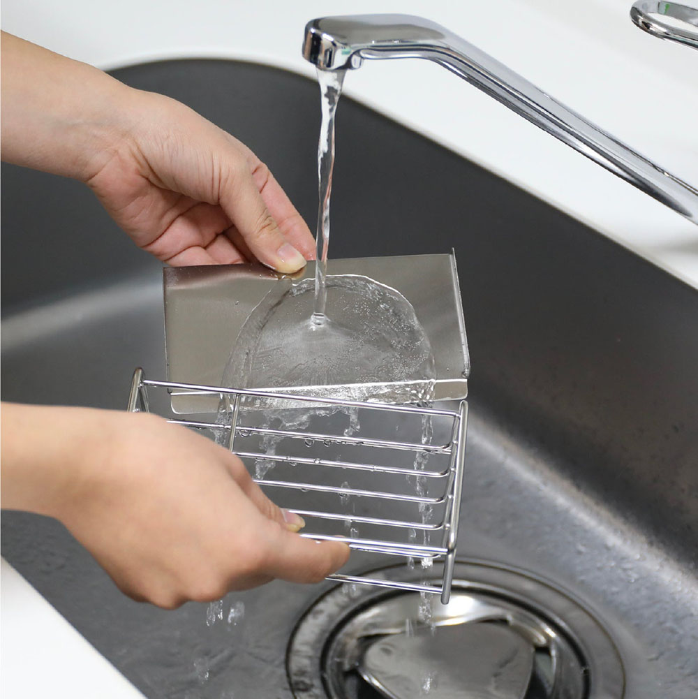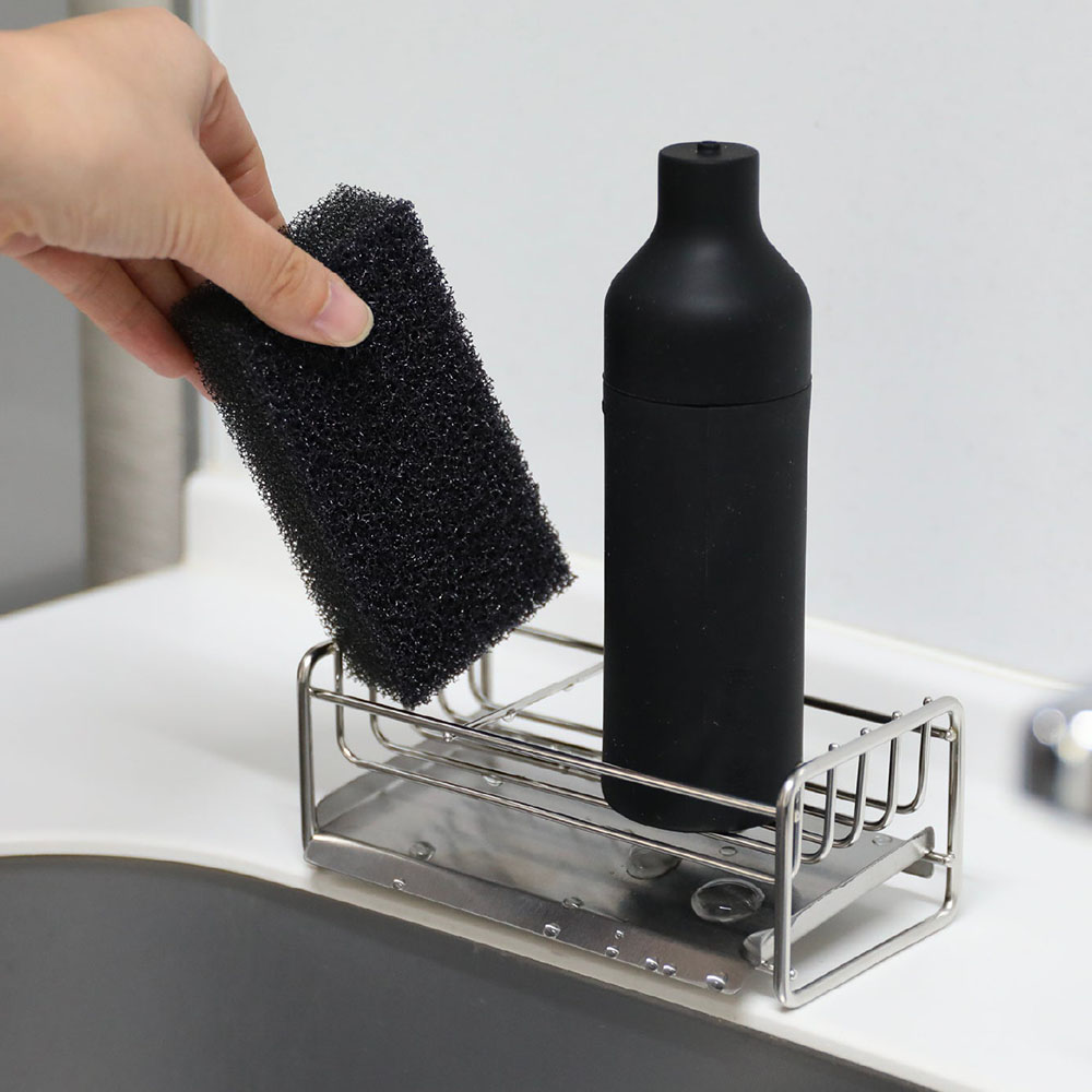 此款不鏽鋼海綿立架,附有傾斜設計的托盤,排水性佳,不易積水。縮減寬度的設計,尺寸比一般海綿立架更精簡,擺放不佔空間。線材內部附有間隔線材,可將海綿與清潔瓶分開擺放,不易傾倒,擺放位置更加穩定。