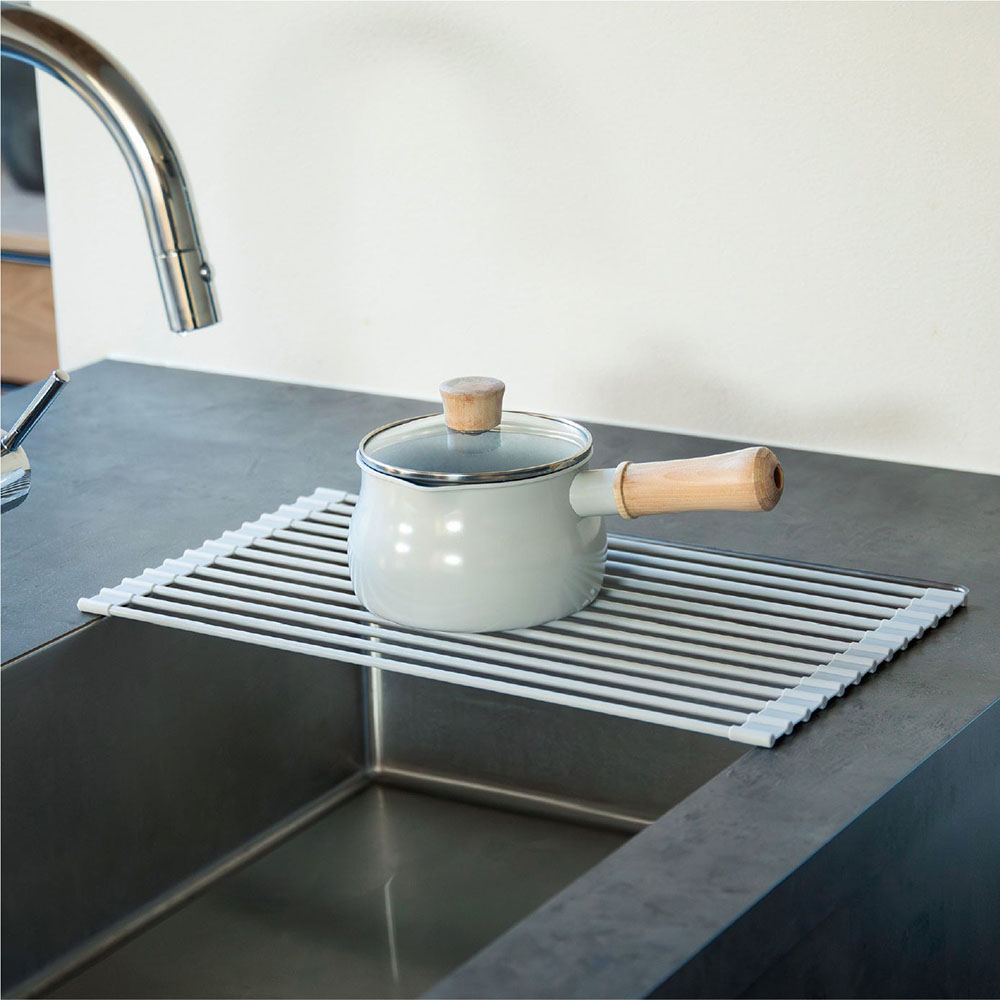 從備料到整理,依作業流程的不同,使用方式隨之改變,可以滿足各種使用需求。不管是想將清洗後的餐盤瀝乾水分、或是想要擴展料理時的作業空間,以及想在料理途中暫時放置鍋具或蔬菜、晾乾抹布等等,皆非常適合使用。使用時展開,不使用時可捲圓收納,收納方便。