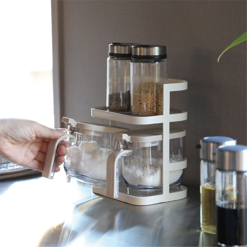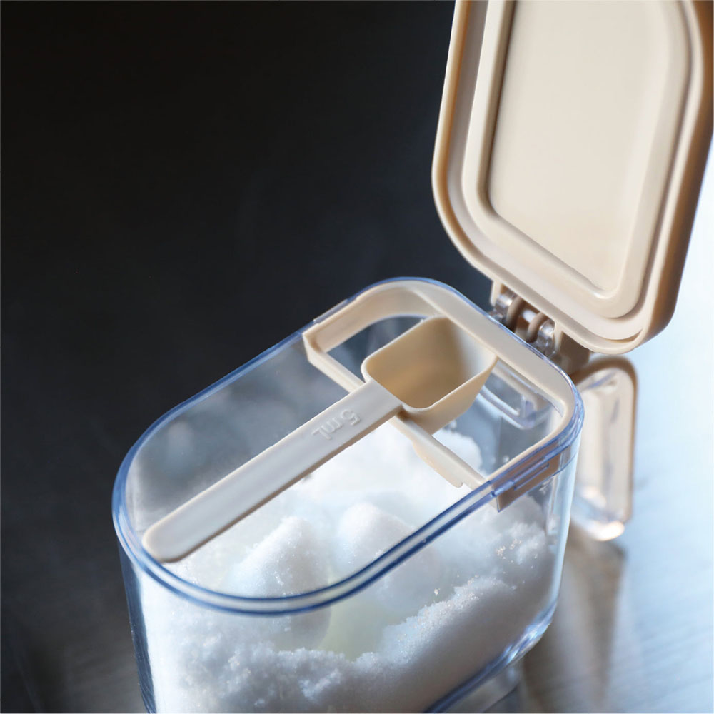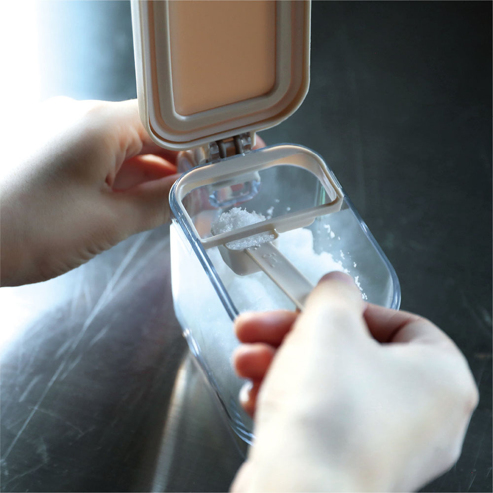 這是一款可單手輕鬆開關的「atomico系列按壓開蓋調味料盒」。密封圈可防止受潮與氣味轉移,維持砂糖與鹽的鮮度。附有可量取1小匙與1/2小匙的專用湯匙,以及方便精準計量的「刮平板」。內部底部採圓角設計,能輕鬆用到最後一點不浪費。