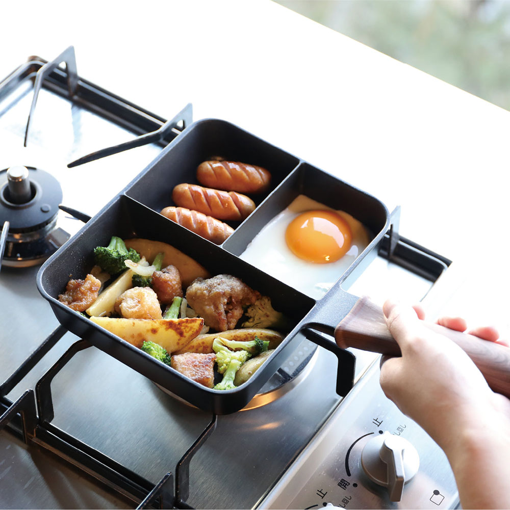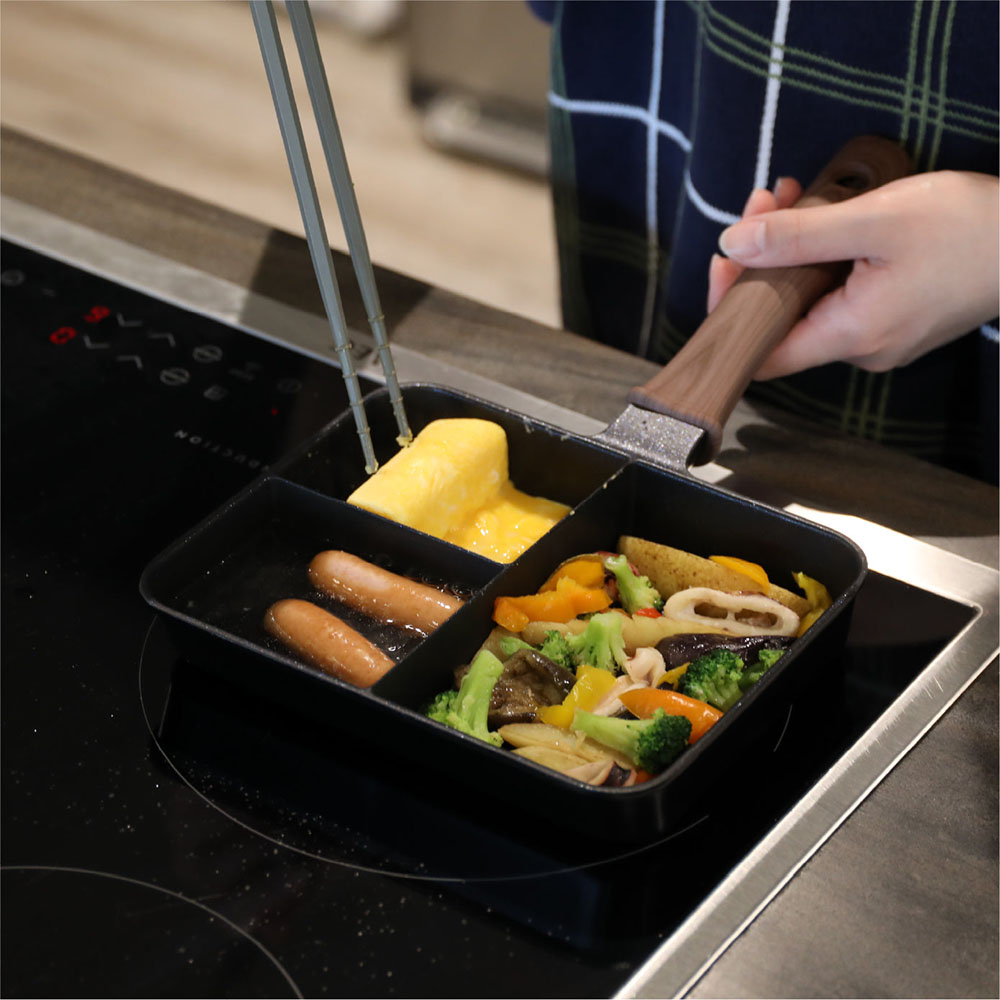 採用深型分隔設計,可防止不同料理的味道與湯汁互相混合,即使只使用一個熱源,也能同時進行「煎、炒、煮」三種料理。在您忙碌的早晨,可同時完成早餐及便當配菜,節省時間並減少清洗的負擔。此款鍋具適用多種熱源,是一款兼具實用與效率的料理好幫手。