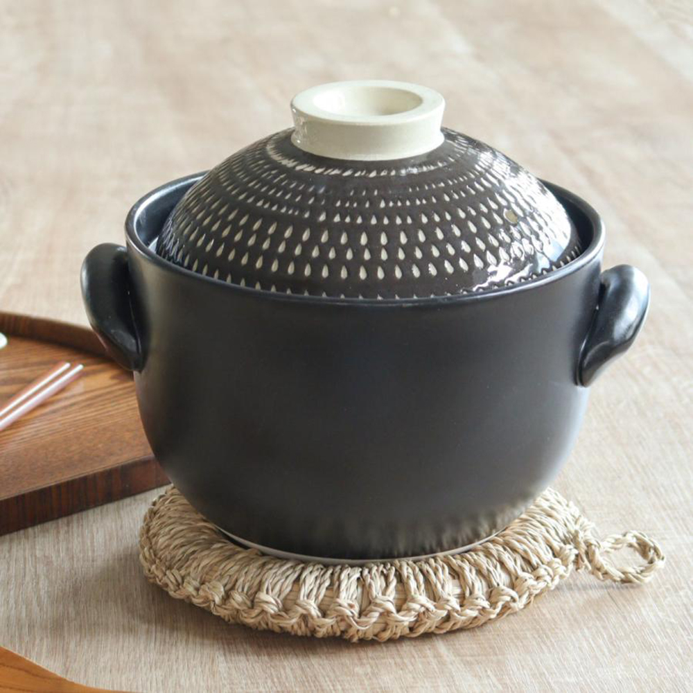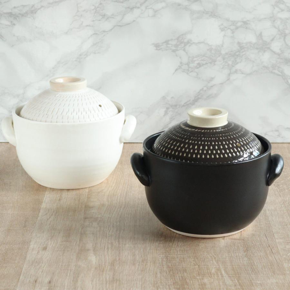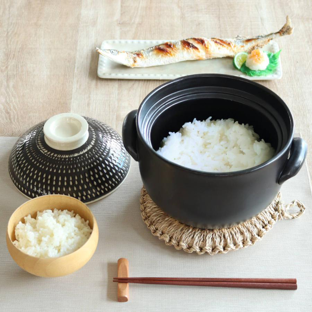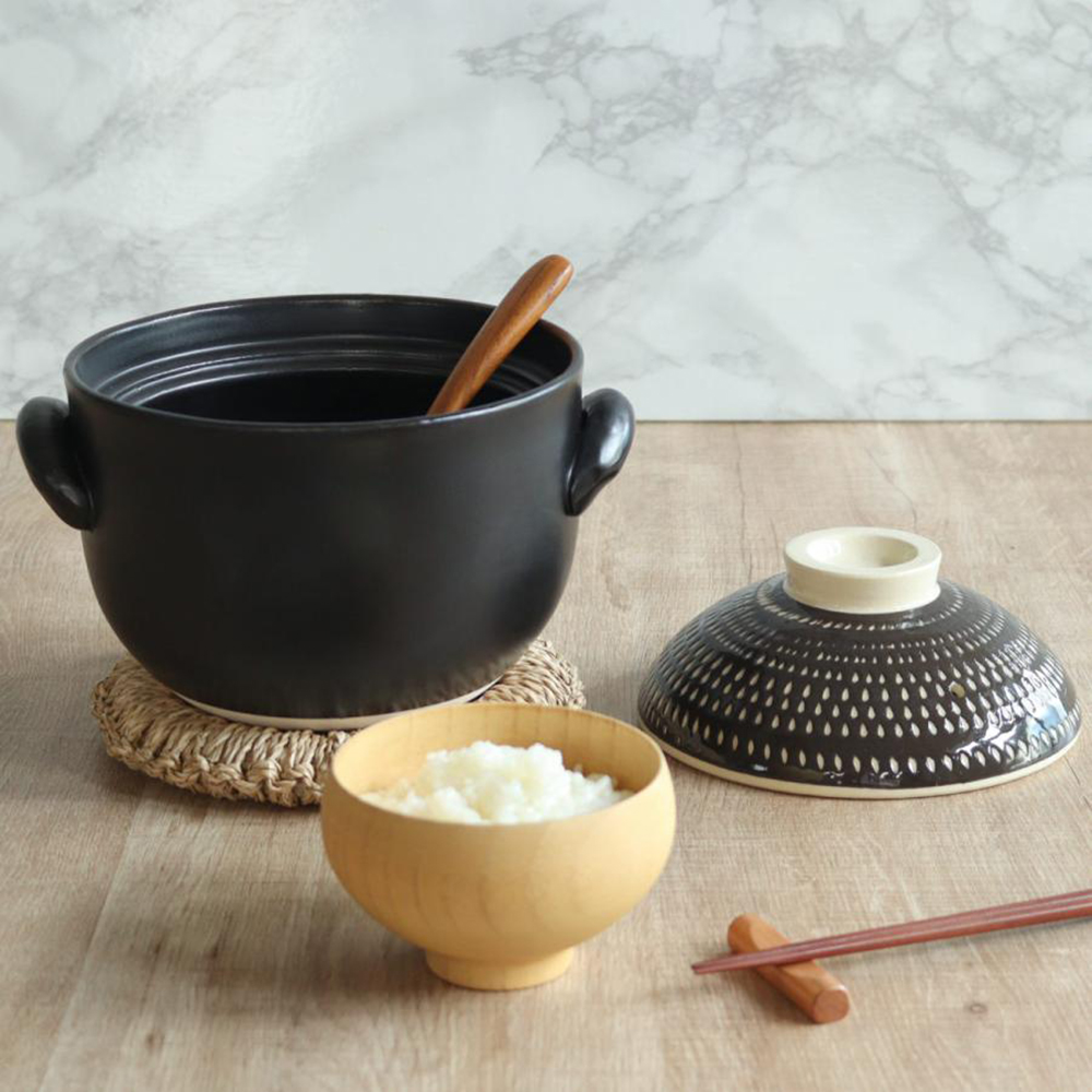 鍋蓋採用飛鉋紋裝飾,兼具傳統工藝之美與實用性,是一款可炊煮三杯米的日式飯鍋。利用土鍋特有的遠紅外線效果與優異的蓄熱性能,能將熱力均勻傳導至米芯,使米飯充分受熱,煮出蓬鬆飽滿、口感香甜的白飯。此款飯鍋特別推薦給喜愛偏硬口感米飯的人使用。因為鍋體設計較薄、導熱性佳,能煮出粒粒分明、富有彈性與咀嚼感的米飯。