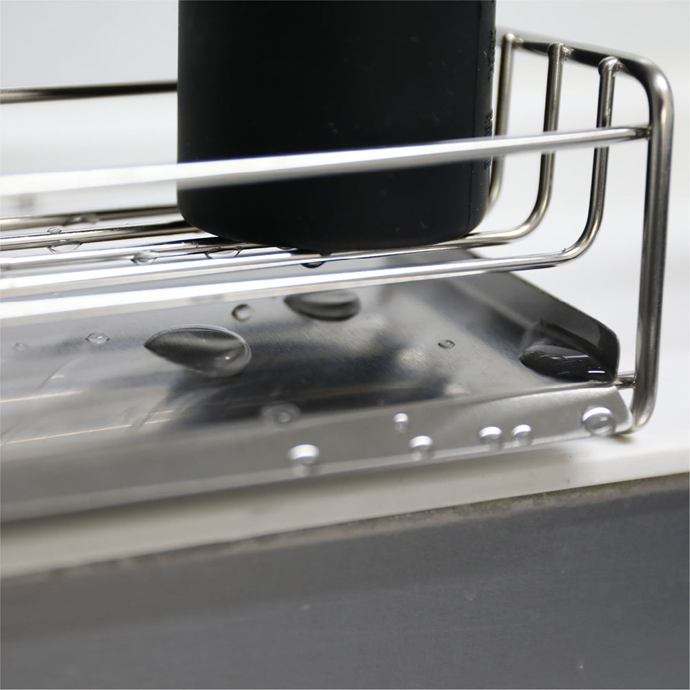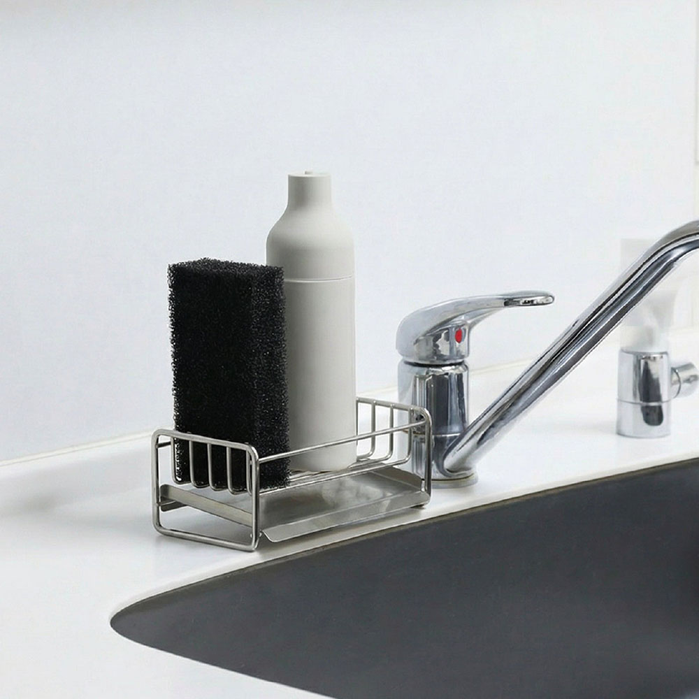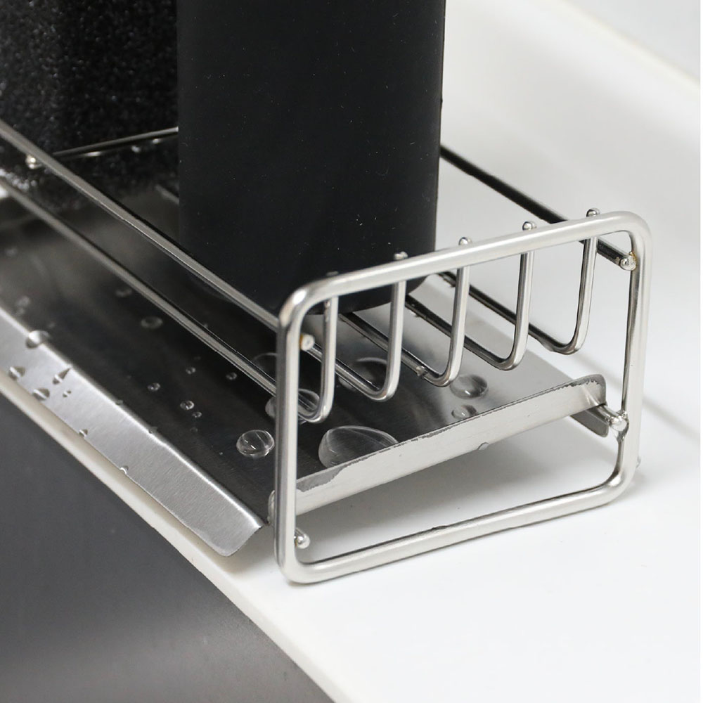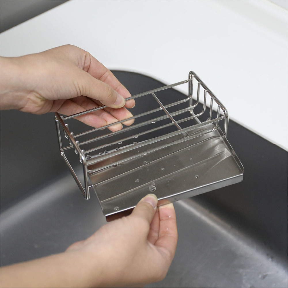 此款不鏽鋼海綿立架,附有傾斜設計的托盤,排水性佳,不易積水。縮減寬度的設計,尺寸比一般海綿立架更精簡,擺放不佔空間。線材內部附有間隔線材,可將海綿與清潔瓶分開擺放,不易傾倒,擺放位置更加穩定。