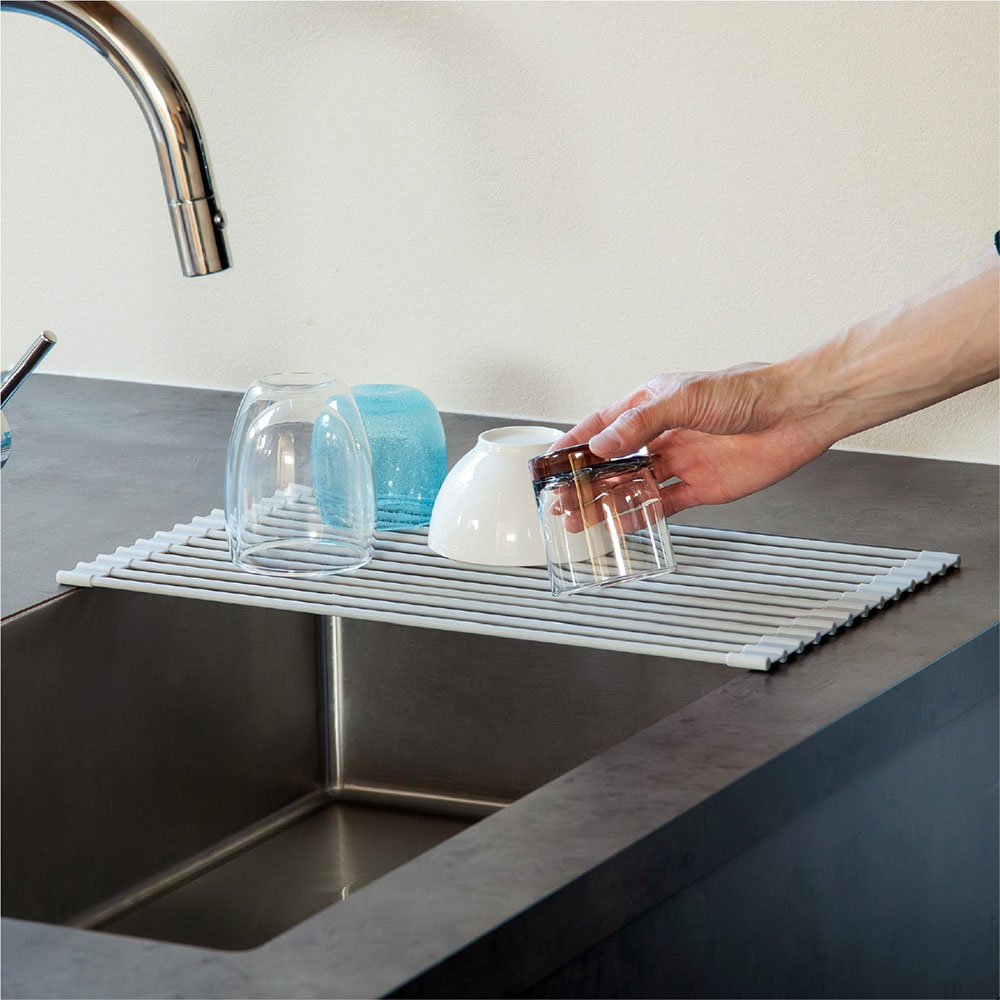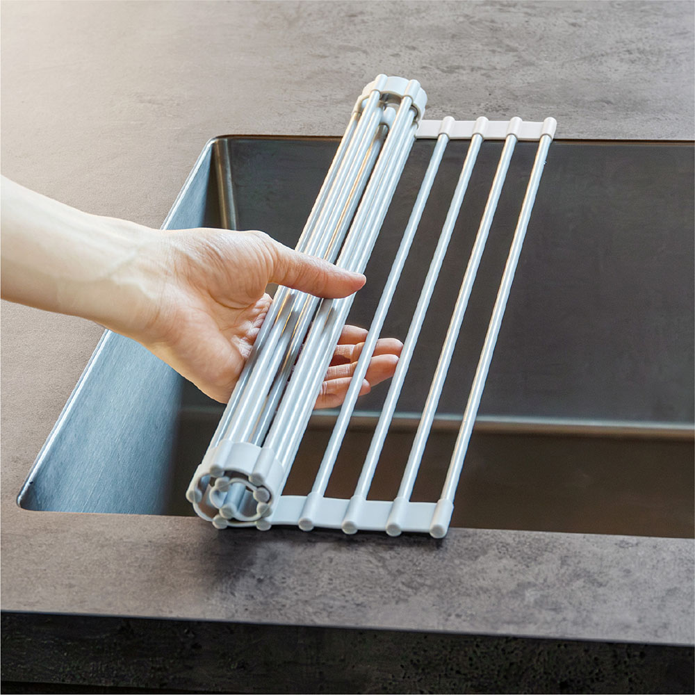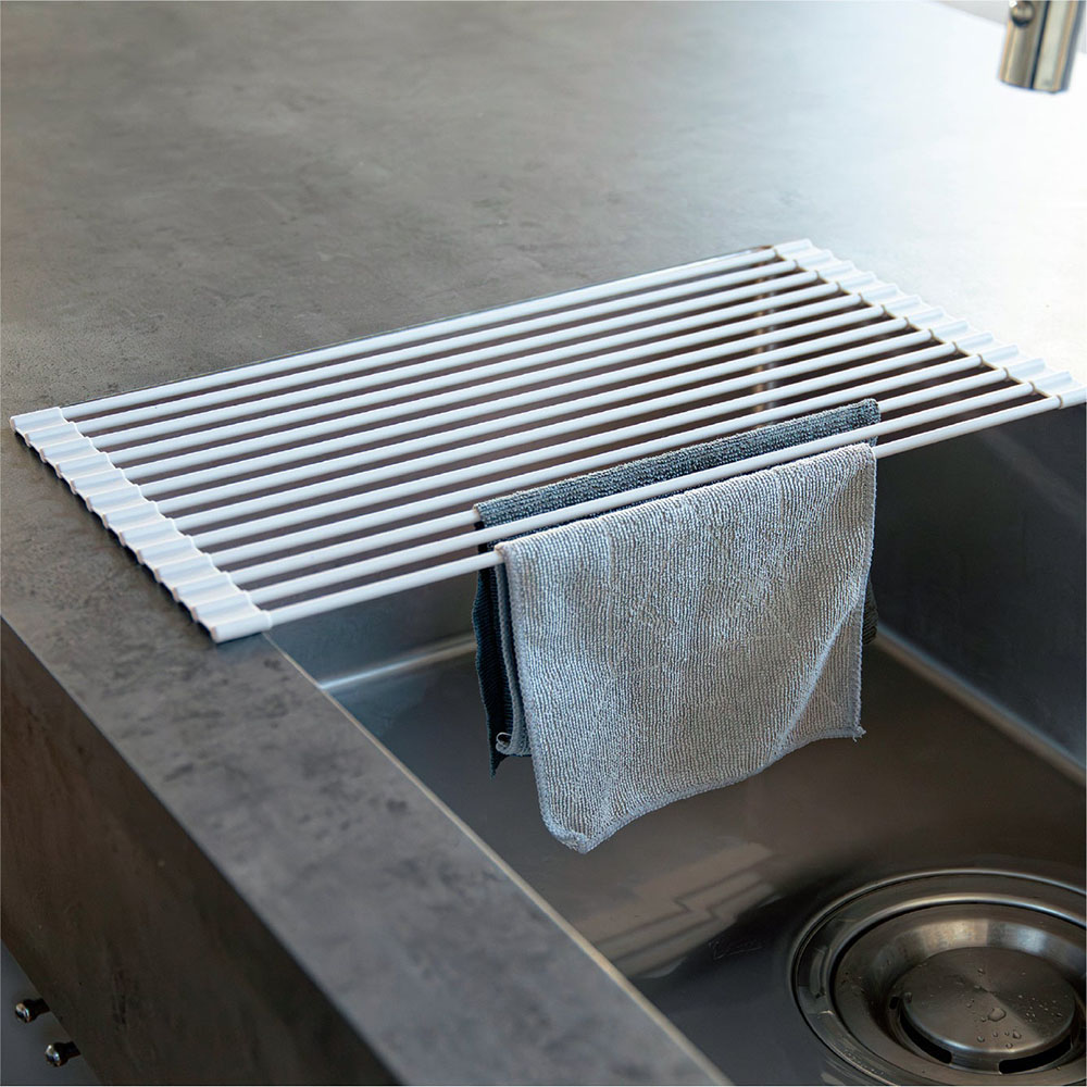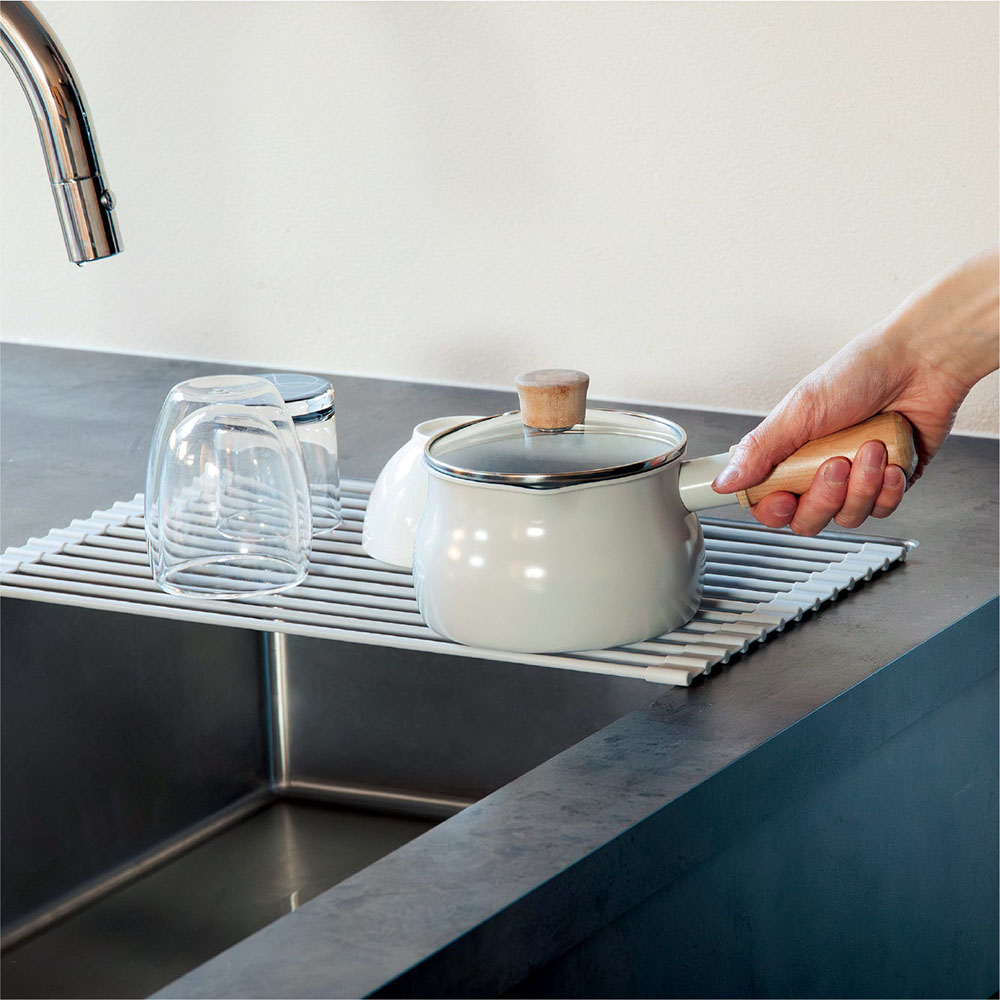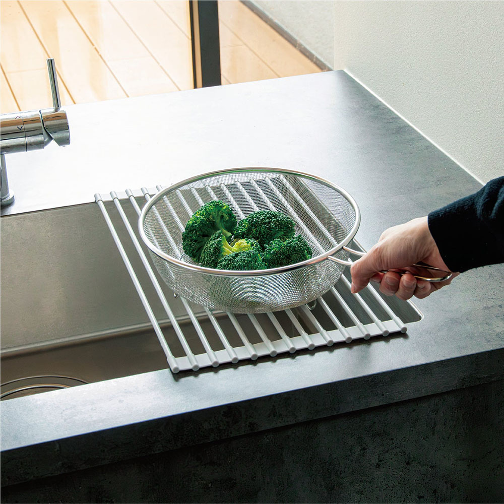 從備料到整理,依作業流程的不同,使用方式隨之改變,可以滿足各種使用需求。不管是想將清洗後的餐盤瀝乾水分、或是想要擴展料理時的作業空間,以及想在料理途中暫時放置鍋具或蔬菜、晾乾抹布等等,皆非常適合使用。使用時展開,不使用時可捲圓收納,收納方便。