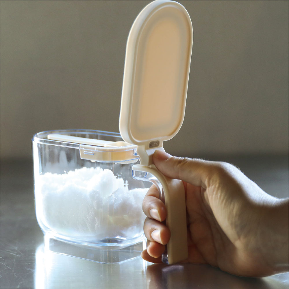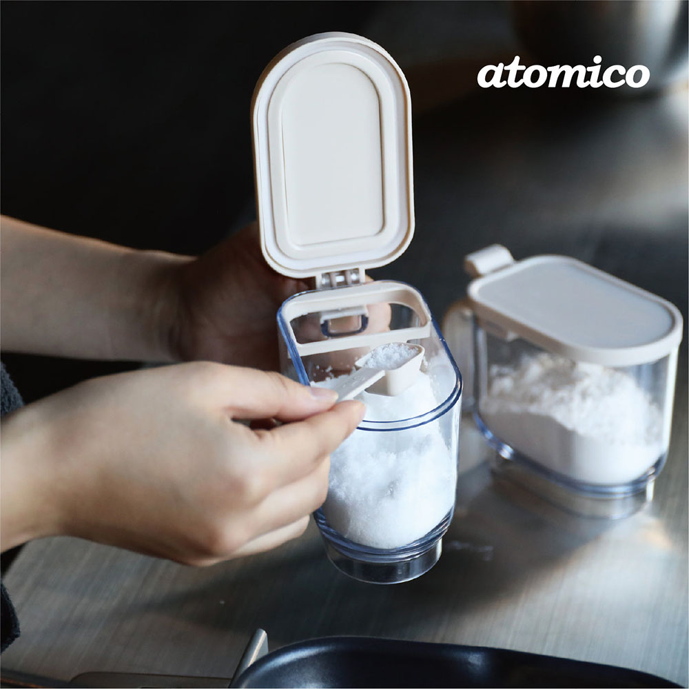 這是一款可單手輕鬆開關的「atomico系列按壓開蓋調味料盒」。密封圈可防止受潮與氣味轉移,維持砂糖與鹽的鮮度。附有可量取1小匙與1/2小匙的專用湯匙,以及方便精準計量的「刮平板」。內部底部採圓角設計,能輕鬆用到最後一點不浪費。