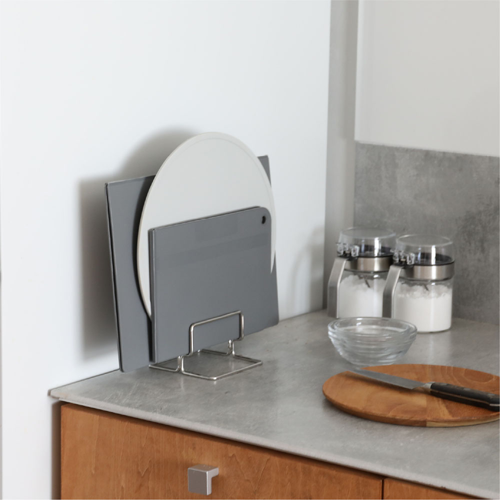 不鏽鋼砧板立架,對於厚度2.5cm以內的長方形砧板,以及常常不知道該如何擺放的圓形砧板都能夠輕鬆收納,立放晾乾,不僅可讓水槽周邊更整潔,也能騰出空間放置碗盤或杯子。雖然只是一個簡單的動作,卻能感受到可利用空間的改變,更加便利。