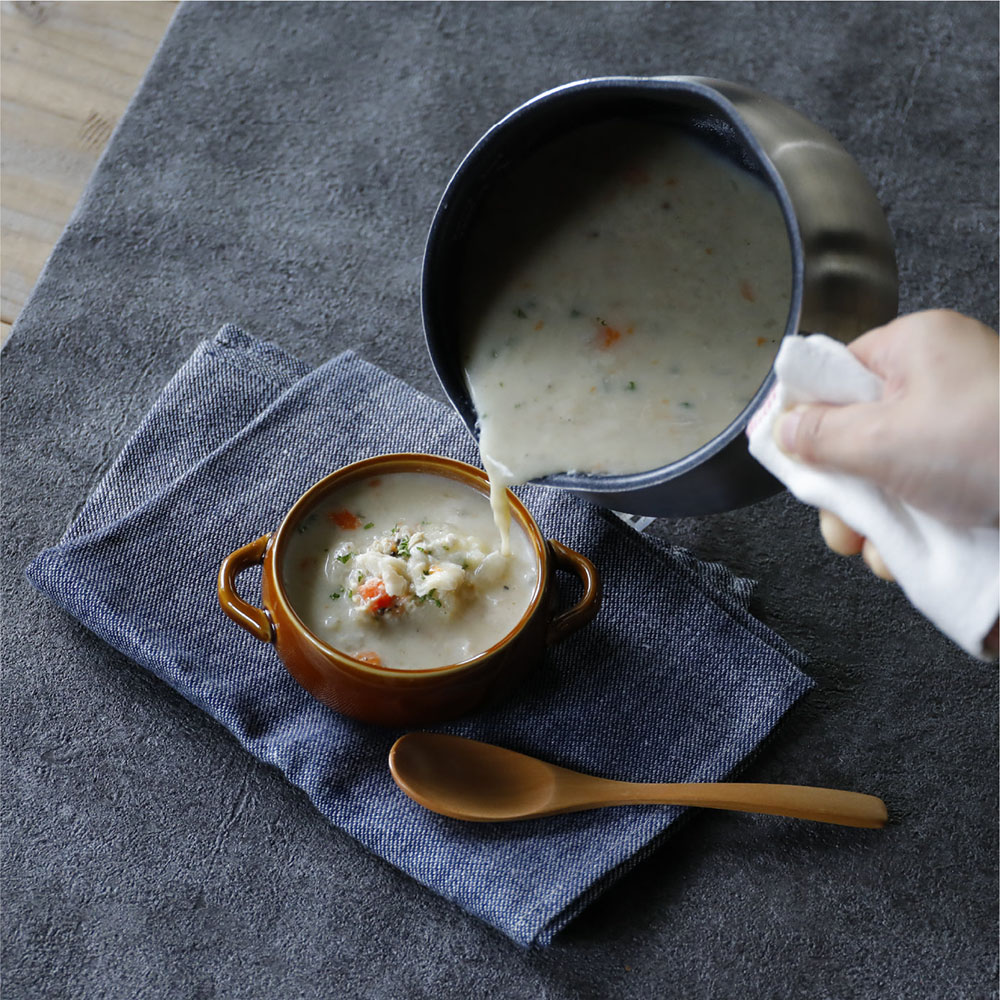 此款二層鋼構造牛奶鍋,是一款具有煮、燙、炸、炒、炊、煮沸等六種用途的實用小鍋,因為能夠均勻加熱料理,且具有良好的保溫性能,可以讓料理不易快速冷卻,並可直接端上餐桌享用美食。