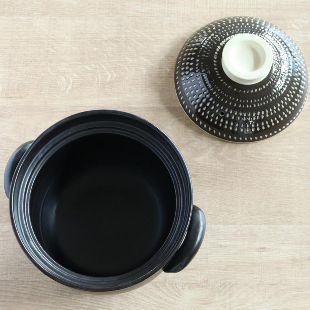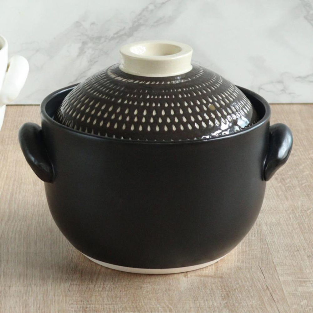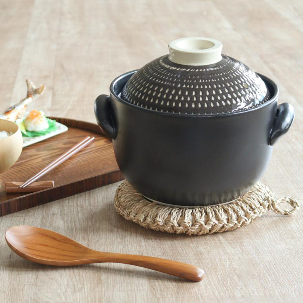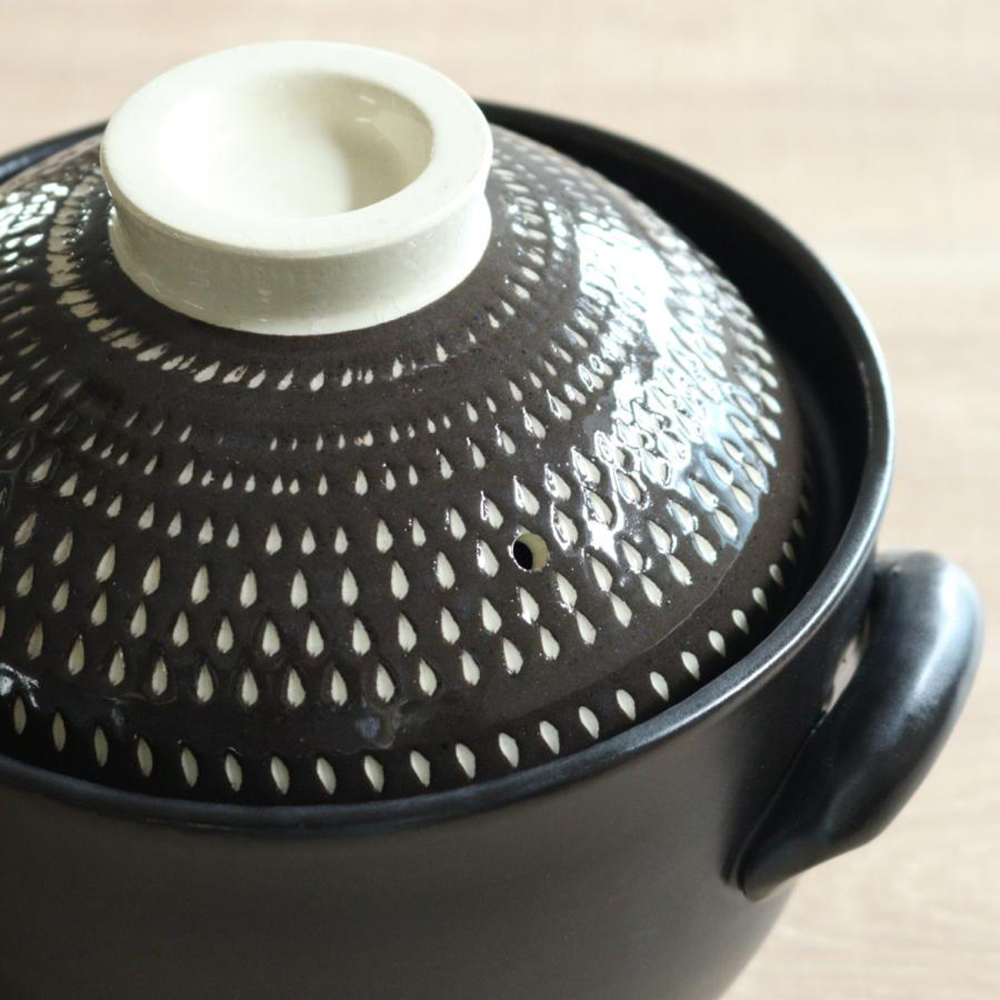 鍋蓋採用飛鉋紋裝飾,兼具傳統工藝之美與實用性,是一款可炊煮三杯米的日式飯鍋。利用土鍋特有的遠紅外線效果與優異的蓄熱性能,能將熱力均勻傳導至米芯,使米飯充分受熱,煮出蓬鬆飽滿、口感香甜的白飯。此款飯鍋特別推薦給喜愛偏硬口感米飯的人使用。因為鍋體設計較薄、導熱性佳,能煮出粒粒分明、富有彈性與咀嚼感的米飯。